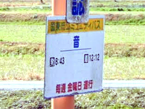 「音」1文字のバス停は他にはない模様です。カーブミラーに併設したバス停標も珍しいと思います。公的住所にはなっていません。音の由来は分かりませんでした…。 GoogleStreetView |