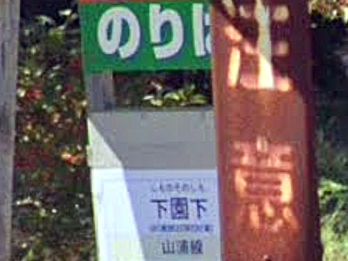 「山本山」形式のバス停です。「山浦下園」(やまうらしもその)という公的住所があるので、このバス停は「下園・下」なのでしょう。下園の由来は分かりませんでした…。「下園妙見様湧水(しものそのみょうけんさまゆうすい)」があり、「名水百選に選ばれている」そうです。(Wikipedia) GoogleStreetView |