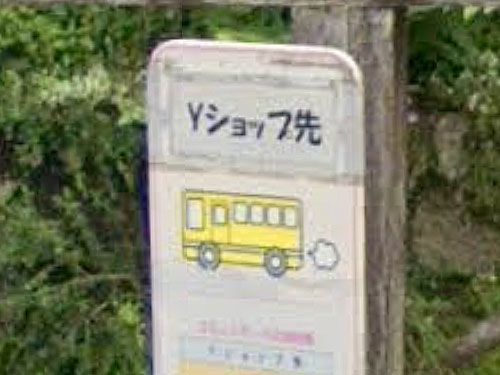 Yショップ(ヤマザキショップ)は地方に多い、山崎製パン系列のコンビニです。「Yショップ」が付くバス停は全国でかなり少ないようです。このバス停からYショップまで徒歩2分(160m)とのこと。バスのイラストが少し可愛いです。 GoogleStreetView |