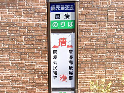 難読地名ですが、市電の唐湊停留場があり、唐湊線という路線名にもなっているので、鹿児島市民にはよく知られているようです。バス停は電停からかなり離れた場所にあり探すのに少し苦労しました。「この付近が唐の船が着いた湊であったという説や、この付近に唐人が住んでいたという説がある」(Weblio辞書)。 GoogleStreetView |