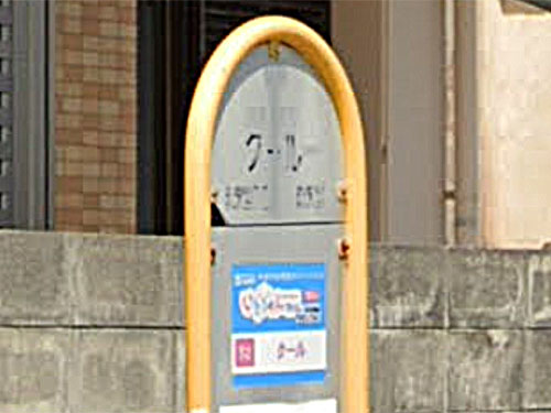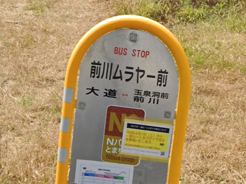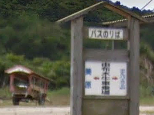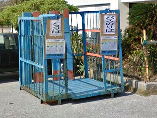 珍名ではありません。貨物輸送用の大きなカゴがラフなバス停になっています(笑)。村役場にもバス停標がないので、他のバス停にもないのかも知れませんが、「チカノー」「サキダガー」「ククヤガー」「トゥーミーカー」といった気になるバス停があります(粟国空港バス停はストリートビューなし)。 GoogleStreetView |