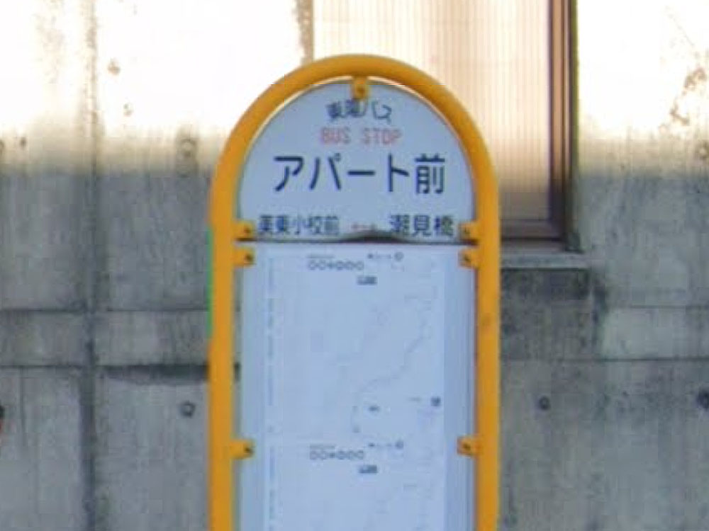 沖縄にもありました。全国には「○○アパート前」バス停はたくさんありますが、単なる「アパート前」は数えるほどです。ざっくりした名前です。 GoogleStreetView |