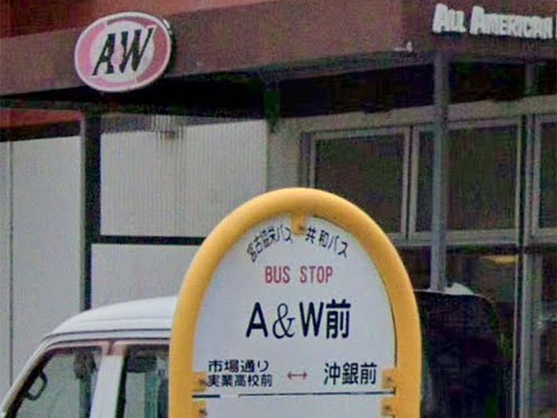 日本では沖縄のみにあるファストフード店です。沖縄の中で、ずばり店名が使われているバス停はここだけのようです。「A&Wの名は、創業者のロイ・アレン(Roy Allen)と、1919年に彼と提携したフランク・ライト(Frank Wright)の2人のファミリーネームの頭文字に由来する」(Wikipedia)。 GoogleStreetView |