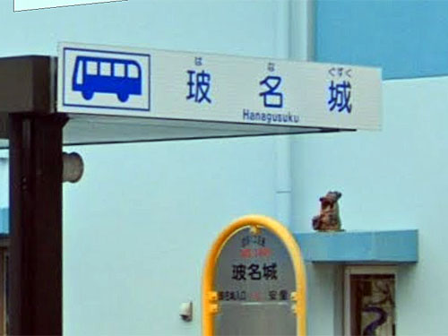 「玻」は「ハ」と読み、「七宝の一つ「玻璃(ハリ)」に用いられる字」とのことです。珍しい字が地名に使われていますね。公的住所になっています。玻名城についてははっきりした由来は分かりませんでした…。 GoogleStreetView |