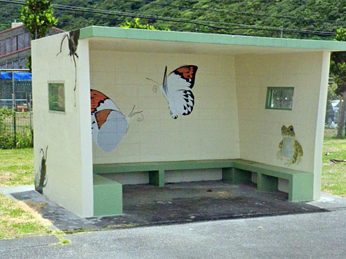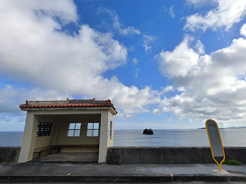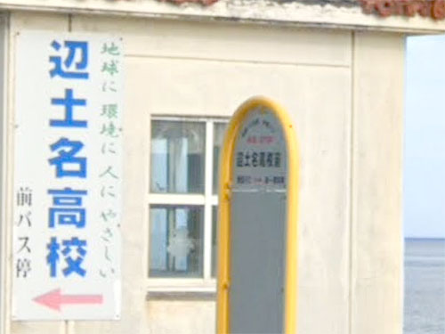 やや難読な高校名ですね。沖縄最北端の高校です。世界自然遺産やんばるの自然を学ぶ環境科があり、沖縄だけでなく全国から生徒が集まっています。 バス停標と海側の待合室は、佐渡の「恋するバス停」くらい魅力的な風景だと思います。(ただ、国道58号線の交通量が多いし車がスピードを出す場所なので、撮影はお気をつけください。) 山側の待合室には、高校生が固有種(ツマベニチョウやオキナワイシカワガエルなど)の絵を書いていて、これも可愛いです。 GoogleStreetView |